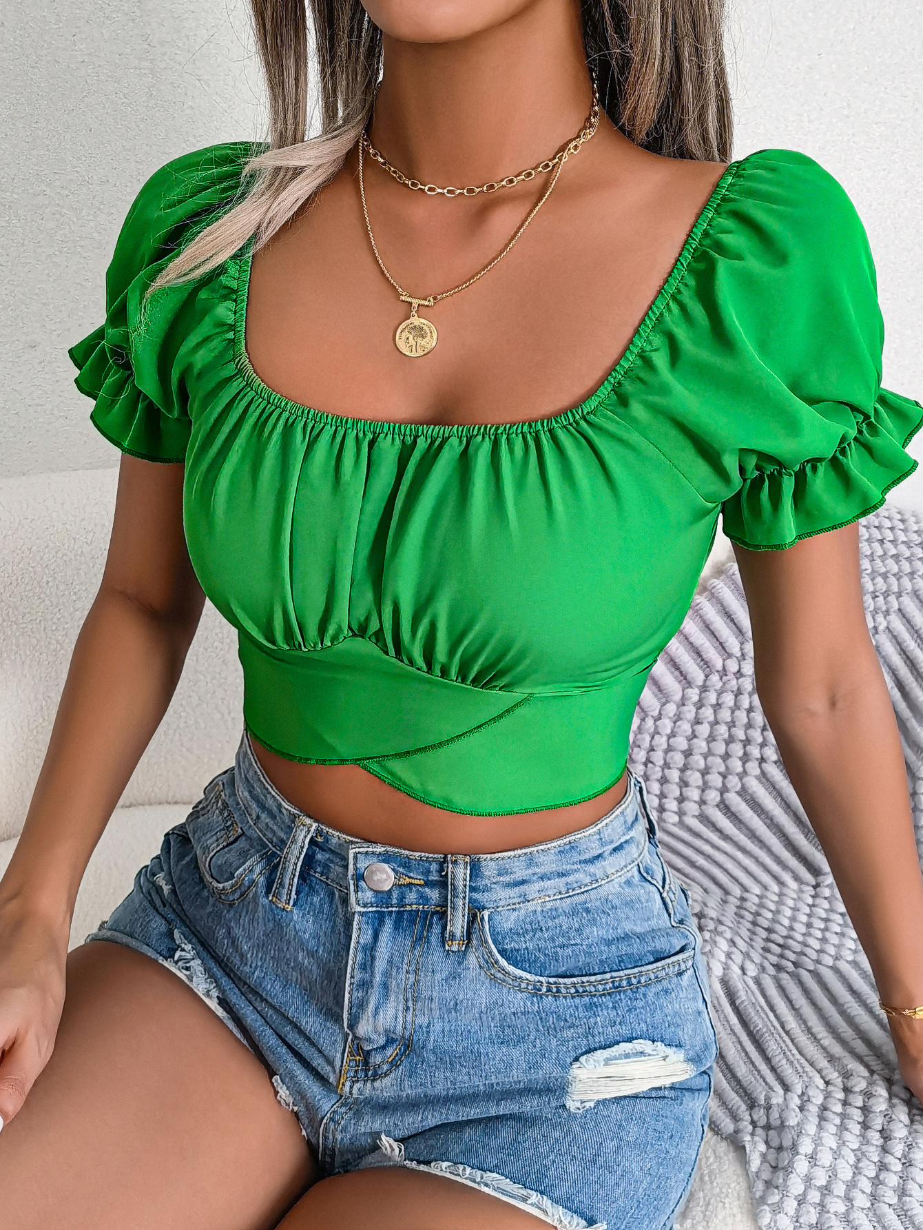 Women Casual Short Sleeve Tie Waist Chiffon Crop Top